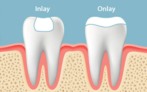 Inlays are recommended to replace the inside biting portion of a tooth when the healthy structure remains on the outside biting portion of the tooth. Onlays are used to replace broken cusps or to add strength to compromised areas around the perimeter of the tooth.